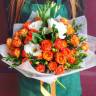 Достойный букет из кустовых роз и белых лизиантусов. Обязательно станет украшением любого стола.